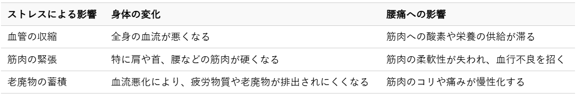 特に、長期間にわたる精神的なプレッシャーや不安、睡眠不足などが続くと、身体は知らず知らずのうちに緊張状態に陥ります。この緊張が、腰の筋肉や神経系に影響を及ぼし、慢性的な腰痛として症状が現れることがあるのです。