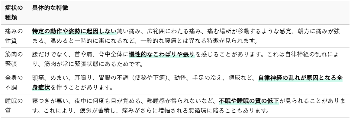 ストレスが原因で引き起こされる腰痛は、一般的な腰痛とは異なる特徴を示すことがあります。単なる身体的な痛みだけでなく、心の状態とも密接に結びついているため、多岐にわたる症状が複合的に現れるのが特徴です。