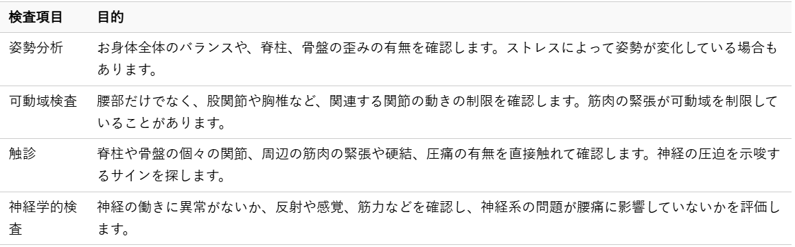 問診では、腰痛がいつから、どのような状況で発生し、どのような時に悪化するのかといった基本的な情報に加え、睡眠の質、食生活、仕事や人間関係におけるストレスの有無、過去の病歴なども細かくヒアリングいたします。これらの情報から、ストレスが腰痛にどのように影響しているのか、その背景にある要因を探っていきます。