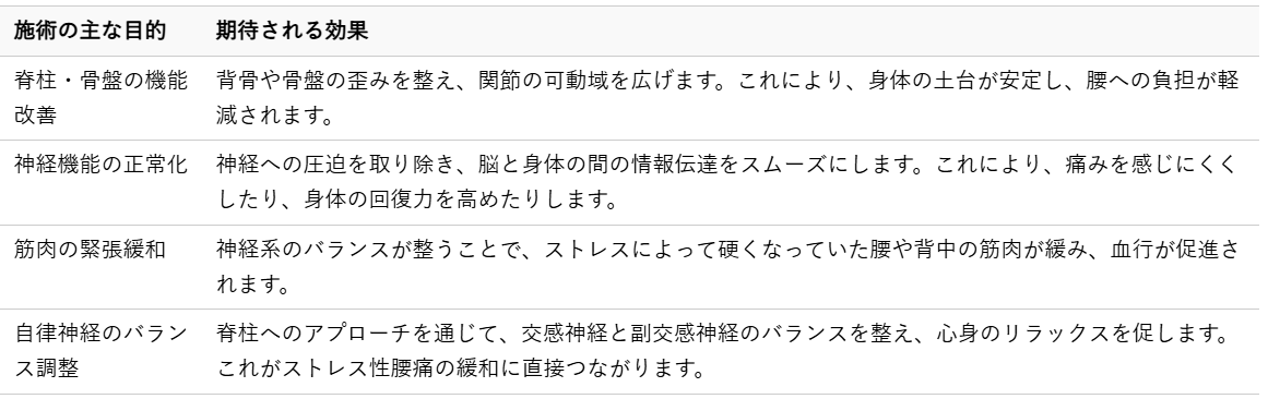 ストレス性腰痛の場合、自律神経のバランスが乱れ、筋肉が過度に緊張していることが多いため、神経系の働きを整えることが特に重要になります。脊柱には自律神経が密接に関わっており、骨格の歪みを整えることで、自律神経のバランスが安定し、全身の筋肉の緊張が緩和され、心身のリラックスへとつながることが期待できます。