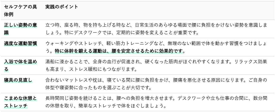 これらのセルフケアは、即効性があるわけではありませんが、継続することで心身のバランスを整え、腰痛の根本的な改善と予防につながります。カイロプラクティックによる施術と合わせて、日々の生活に取り入れてみてください。