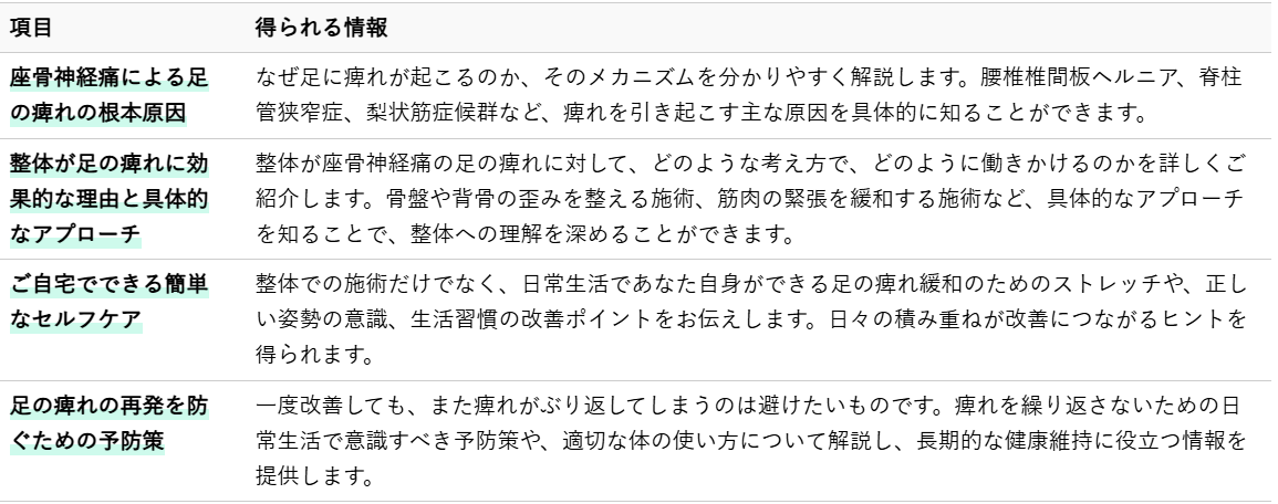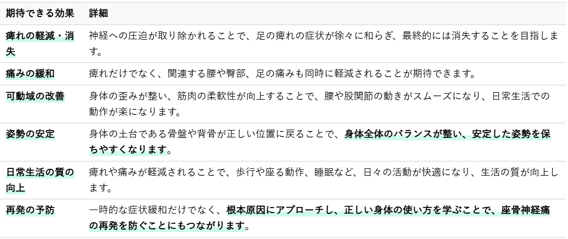 整体によるアプローチは、座骨神経痛の足の痺れに対して、多岐にわたる改善効果が期待できます。以下に主な効果をまとめました。