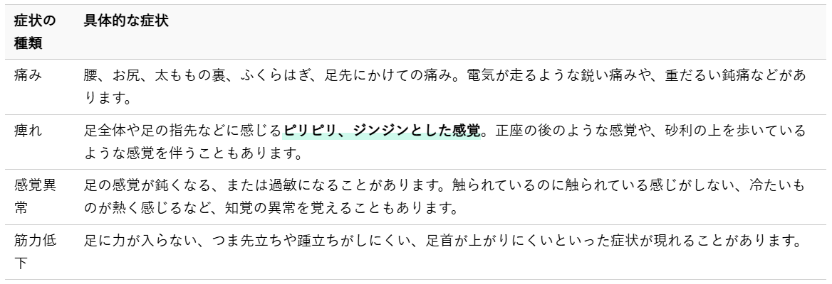 座骨神経痛の症状は多岐にわたりますが、特に足の痺れは日常生活に大きな影響を与えることが多いです。主な症状は以下の通りです。