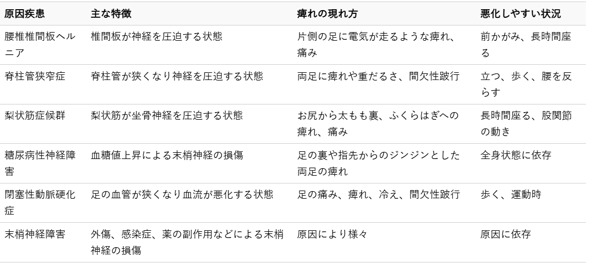 座骨神経痛のような足の痺れは、上記以外にも様々な原因で引き起こされることがあります。整体でのアプローチとは異なる専門的な対応が必要となる場合もあるため、ご自身の症状がどこから来ているのかを理解することはとても大切です。