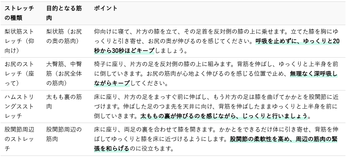 温めることで血行が促進され、筋肉の緊張が和らぐことがあります。温かいタオルやカイロなどを腰やお尻に当ててみてください。ただし、炎症が強い場合は冷やす方が楽になることもあります。ご自身の感覚で、心地よいと感じる方を選んでください。 - 無理にストレッチをしない