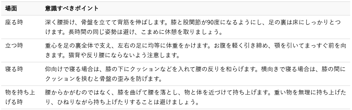 正しい姿勢は、腰や骨盤への負担を軽減し、座骨神経への圧迫を防ぐ上で最も基本的な予防策です。座る、立つ、歩くといった日常の動作一つひとつで、ご自身の姿勢を意識することが大切です。
