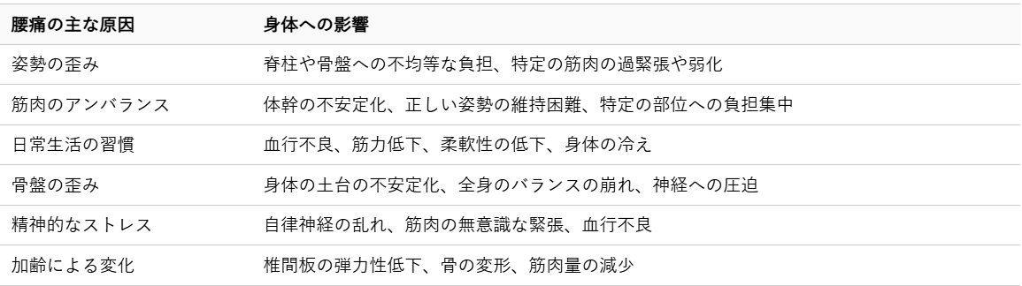 腰痛の原因は一つではなく、日常生活の習慣や身体の状態が複雑に絡み合って発生することがほとんどです。整体師の視点から、腰痛を引き起こす主な原因とそのメカニズムについて詳しく解説いたします。