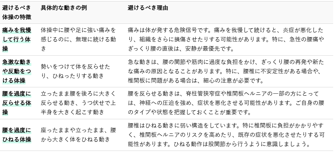 以下の表で、避けるべき腰痛体操の特徴と、その理由について詳しくご説明いたします。