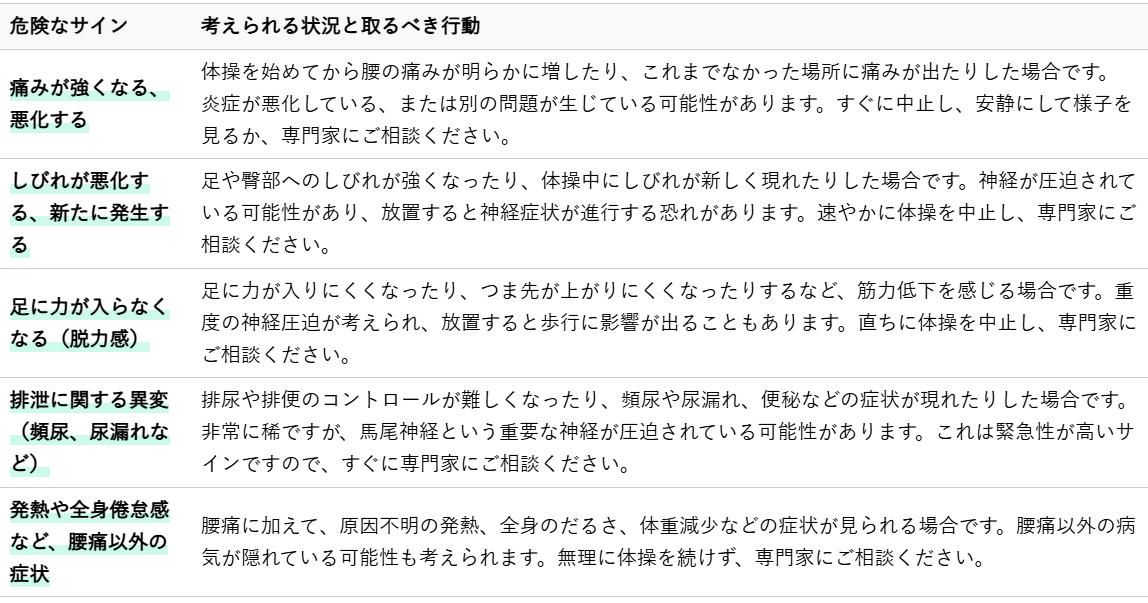 腰痛体操は、適切に行えば腰痛の改善に役立ちますが、体操中に以下のような症状が現れた場合は、すぐに中止して専門家にご相談ください。これらの症状は、より深刻な問題を示している可能性があり、無理に続けると状態が悪化する恐れがあります。