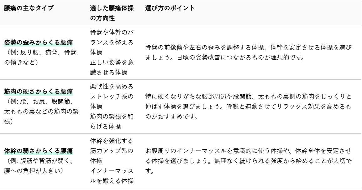これらのタイプを参考に、ご自身の腰痛の原因に心当たりがある場合は、そのタイプに合った体操を優先して取り入れてみてください。