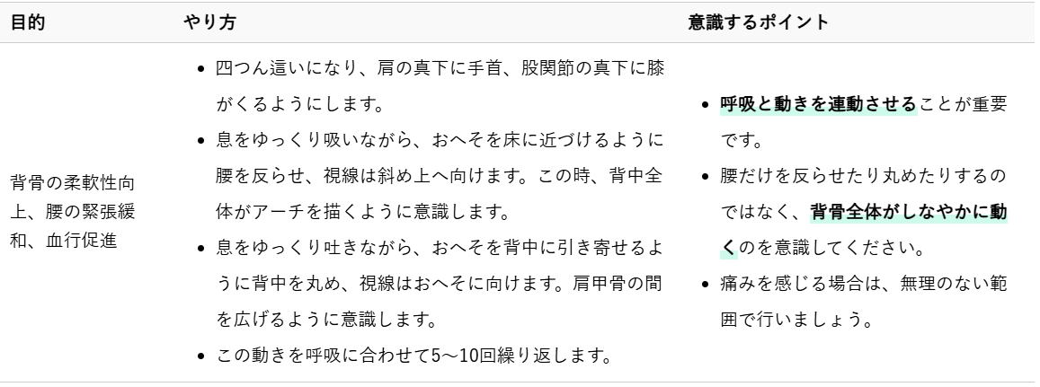 背骨の柔軟性を高め、腰回りの筋肉を優しくほぐす効果が期待できる体操です。特に朝起きた時や、長時間同じ姿勢でいた後に取り入れると良いでしょう。