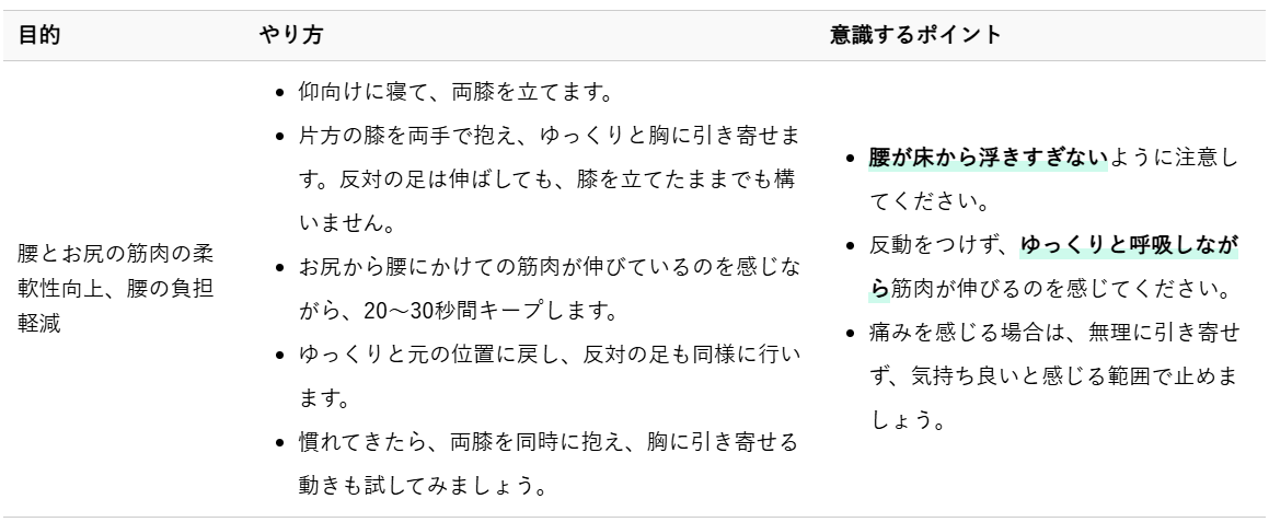 腰の痛みが強い時や、動き始めに痛みを感じる場合は、まず硬くなった筋肉をゆっくりと伸ばし、腰への負担を軽減するストレッチから始めるのがおすすめです。血行を促進し、筋肉の緊張を和らげる効果が期待できます。
