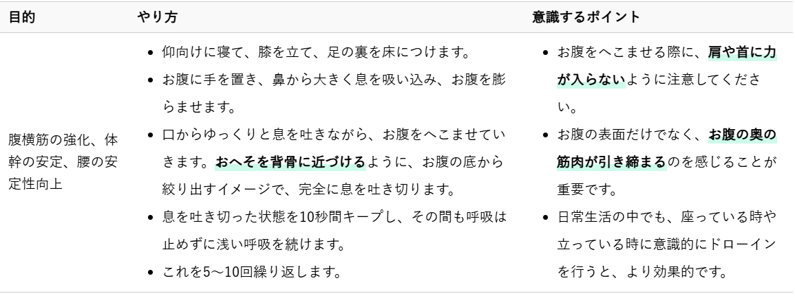「ドローイン」は、お腹の奥にあるインナーマッスル(腹横筋)を効果的に鍛えることができる、最も基本的な体幹トレーニングです。腰を安定させるコルセットのような役割を果たす腹横筋を強化することで、腰痛の予防・改善につながります。