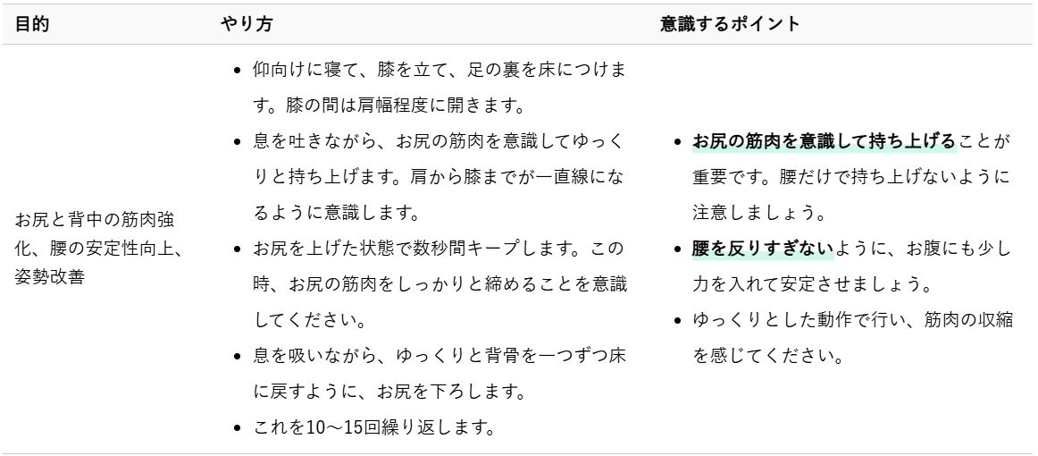 ブリッジは、お尻の筋肉(大臀筋)や太ももの裏の筋肉(ハムストリングス)、そして背中の筋肉を同時に鍛えることができる体操です。これらの筋肉を強化することで、腰を支える力が向上し、腰痛の予防につながります。