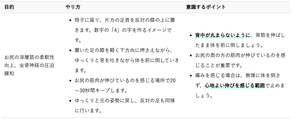 お尻の筋肉、特に梨状筋などの深層筋が硬くなると、坐骨神経を圧迫し、腰痛やお尻から足にかけてのしびれを引き起こすことがあります。この体操でお尻の筋肉をしっかりとほぐし、腰への負担を軽減しましょう。
