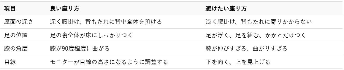 - 座る姿勢: 深く腰掛け、背もたれに寄りかかりすぎず、骨盤を立てて座ります。足の裏は床にしっかりつけ、膝の角度は90度程度を目安にしてください。