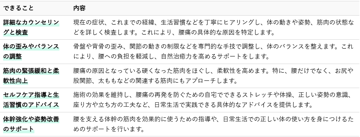 整体院では、あなたの体の状態を詳しく評価し、腰痛の根本原因にアプローチするための専門的な施術やアドバイスを提供しています。単に痛みを和らげるだけでなく、再発しにくい体づくりを目指します。