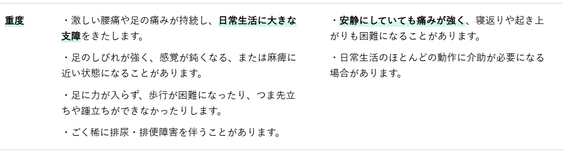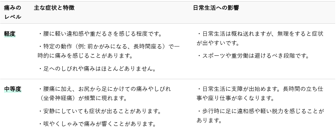 ご自身の痛みのレベルや症状がどの段階に当てはまるかを理解することは、今後の対策を考える上で非常に重要です。特に重度の症状が疑われる場合や、排泄障害などの緊急性の高い症状がある場合は、専門家への速やかな相談が不可欠です。
