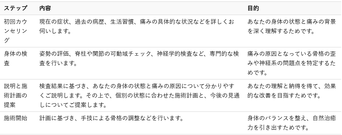 このように、カイロプラクティックでは、いきなり施術に入るのではなく、あなたの状態を徹底的に把握し、納得いただいた上で施術を進めていくことを大切にしています。
