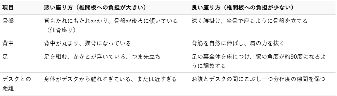 デスクワークや長時間の移動など、座る時間が長い方は特に注意が必要です。椎間板に負担をかけにくい座り方を習慣にすることで、腰への負担を大きく減らすことができます。