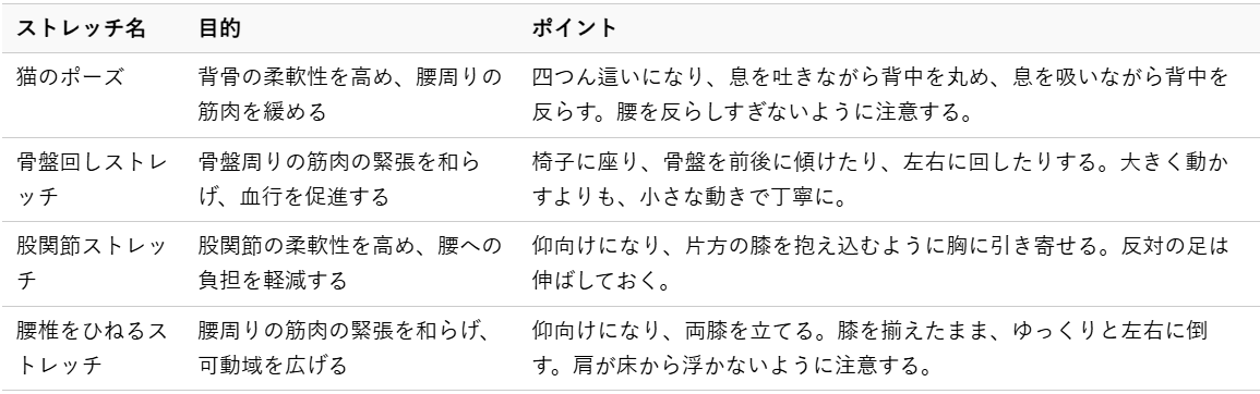 椎間板に負担をかけず、腰周りの筋肉の緊張を和らげるストレッチは、痛みの軽減や可動域の改善に役立ちます。呼吸を意識しながら、ゆっくりと丁寧に行いましょう。