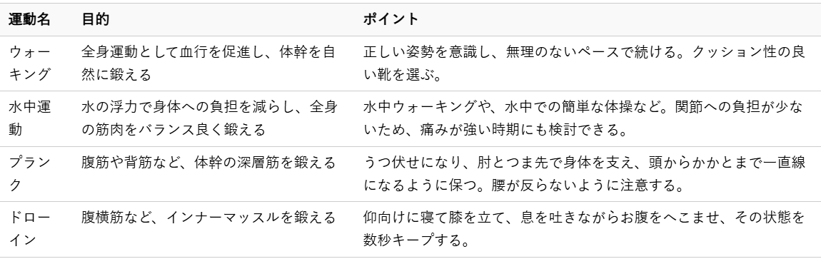 体幹を鍛えることは、身体の安定性を高め、椎間板への負担を軽減するために非常に効果的です。激しい運動ではなく、椎間板に優しい低負荷の運動から始めましょう。
