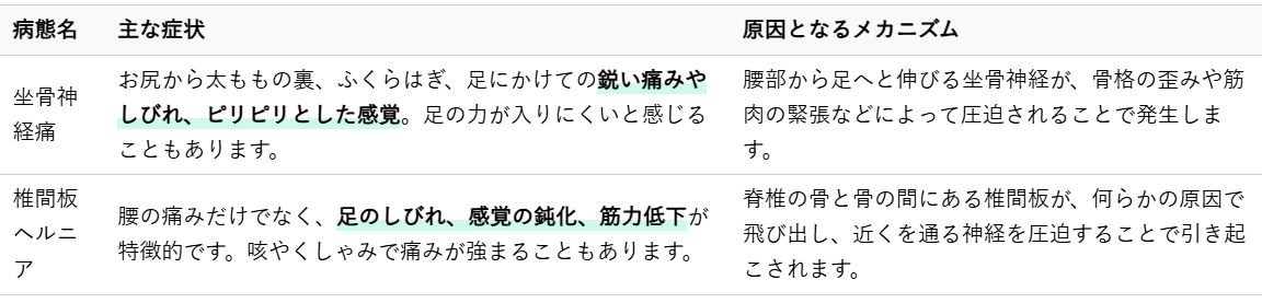 これらの病態は、いずれも腰部の神経に負担がかかることで発症し、日常生活の質を著しく低下させることがあります。ご自身の症状がこれらの病態と合致するようであれば、専門的な視点でのアプローチを検討することが大切です。