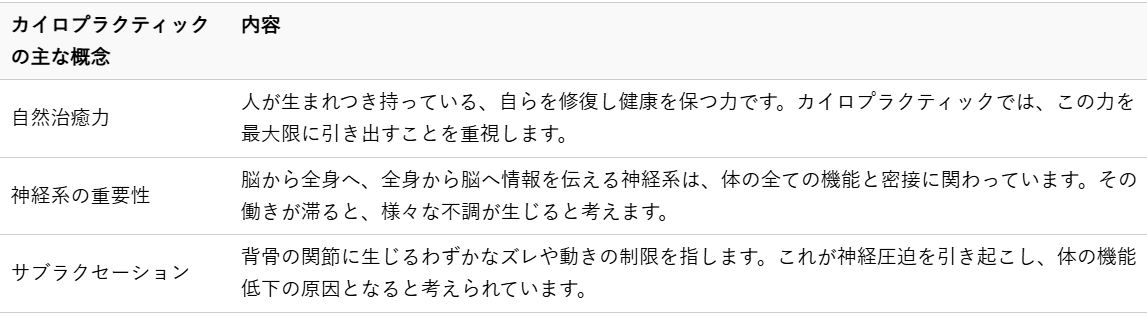 その根底には、「体は自ら健康を維持し、不調を乗り越える力を持っている」という考え方があります。この自然治癒力が十分に発揮されないのは、背骨の歪みによって神経伝達が妨げられているためだと考えます。