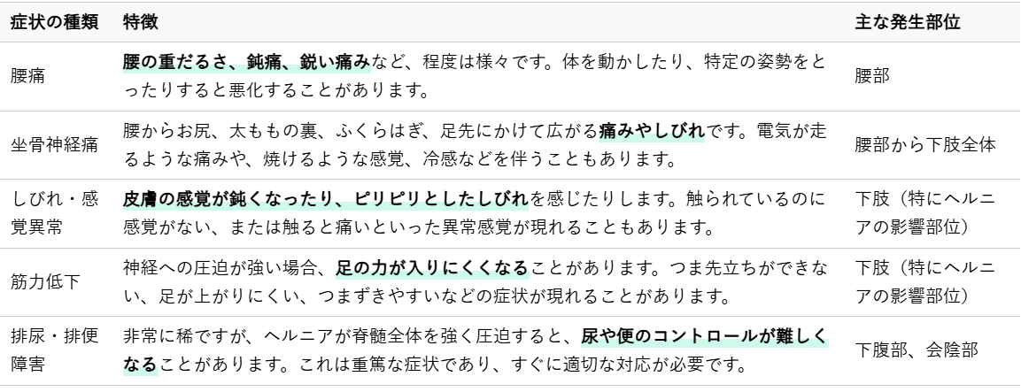 以下に、椎間板ヘルニアで現れる主な症状をまとめました。