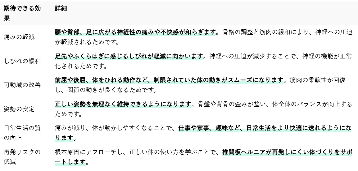 整体を受けることで、椎間板ヘルニアの症状に対して、以下のような具体的な改善効果が期待できます。