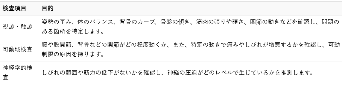 カウンセリングで得られた情報をもとに、次に専門的な検査を行います。体の状態を正確に把握し、椎間板ヘルニアの根本原因がどこにあるのかを見極めるために、いくつかの評価を行います。