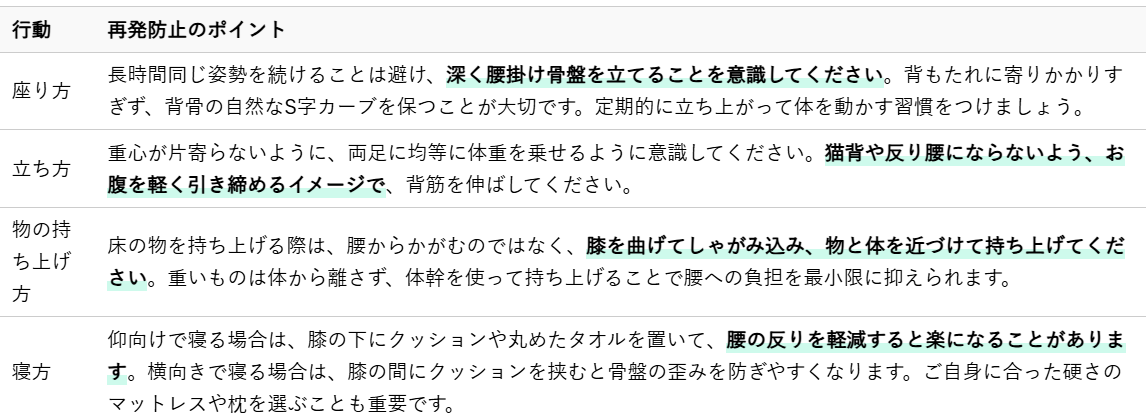 - 正しい座り方、立ち方: デスクワークや長時間の立ち仕事での注意点、腰に負担をかけない姿勢の維持方法をお伝えします。