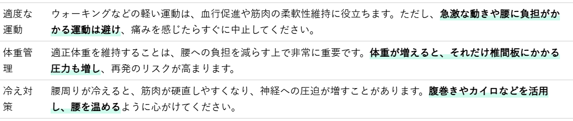 これらの原因や悪化要因を理解し、日常生活の中で意識的に改善していくことが、椎間板ヘルニアの症状緩和と再発防止につながります。