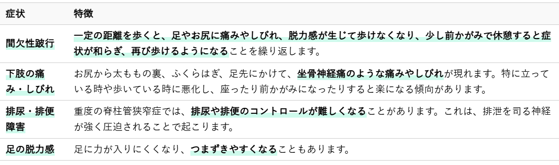 脊柱管狭窄症の症状は、神経が圧迫される部位や程度によって異なりますが、特に特徴的なのが「間欠性跛行(かんけつせいはこう)」です。主な症状は以下の通りです。