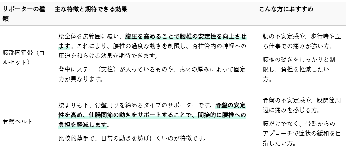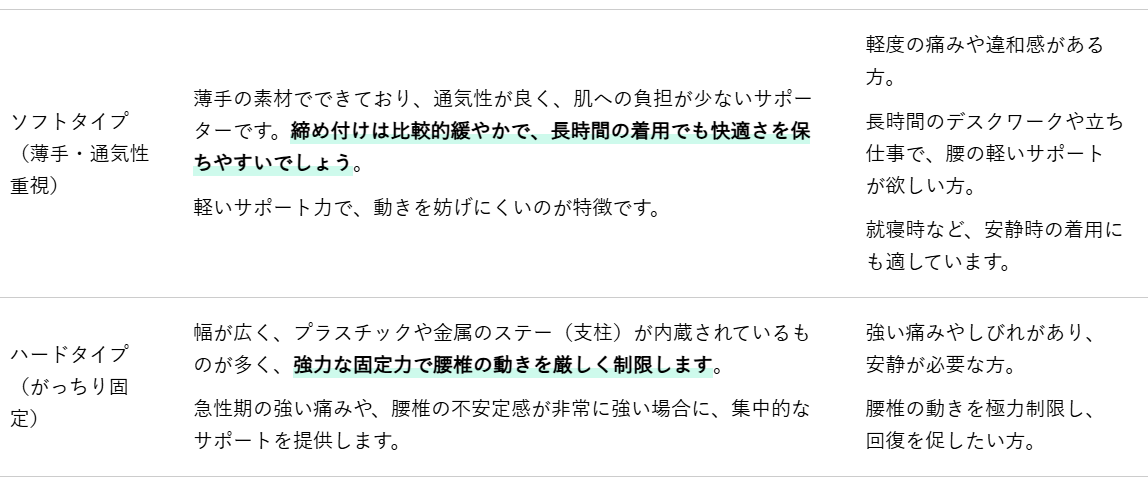 - 強い痛みや不安定感があり、しっかり固定したい場合:幅が広く、ステー(支柱)が入ったハードタイプのサポーターが有効です。腰椎の動きを制限し、安静を保ちやすくなります。