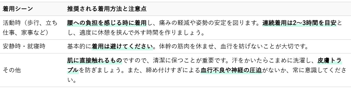 サポーターは、特に体への負担が大きい活動時に積極的に着用しましょう。例えば、家事や仕事で長時間同じ姿勢を保つ必要がある場合、重いものを持つ作業をする場合、あるいは散歩や買い物など外出時に歩くことが多い場合などです。サポーターが脊柱を安定させることで、これらの活動中に生じる負担を軽減し、痛みの発生を抑えることができます。