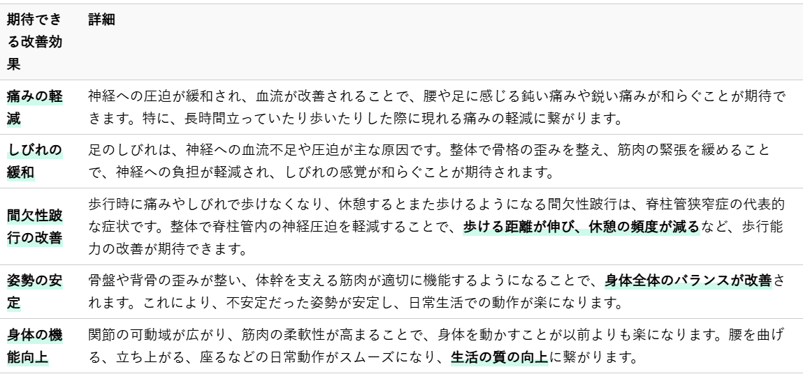 整体による施術は、脊柱管狭窄症の様々な症状に対して、具体的な改善効果をもたらすことが期待されます。ここでは、特に期待できる効果について詳しくご説明します。