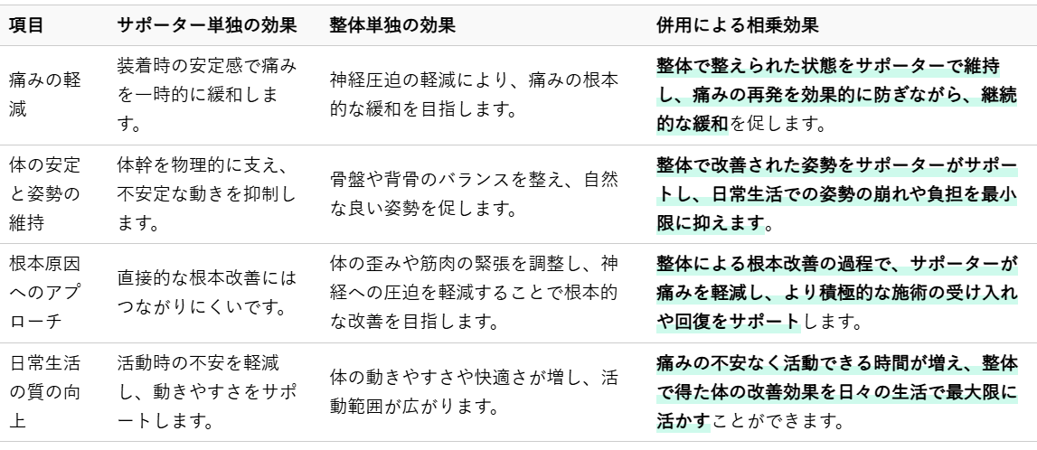 サポーターは主に外部から脊柱をサポートし、過度な動きや負担を軽減することで、痛みを和らげる役割を担います。一方、整体は体の歪みや筋肉の緊張を調整し、神経への圧迫を軽減することで、根本的な改善を目指します。この二つのアプローチを組み合わせることで、以下のような相乗効果が期待できます。
