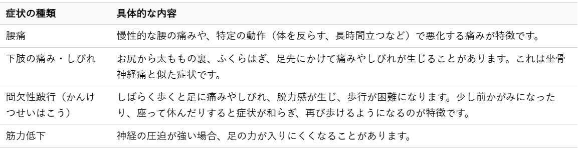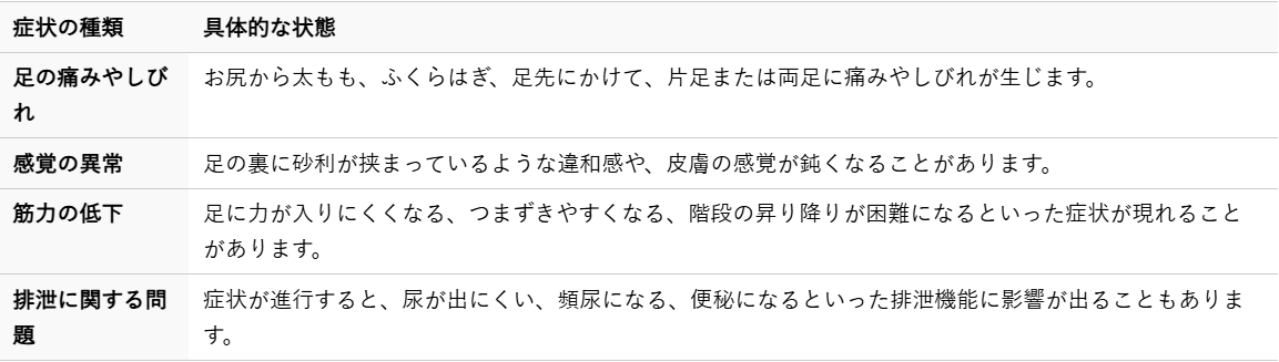 腰椎すべり症の主な症状は、腰の痛みや下肢(足)へのしびれ、だるさです。これらの症状は、神経が圧迫されることによって引き起こされます。