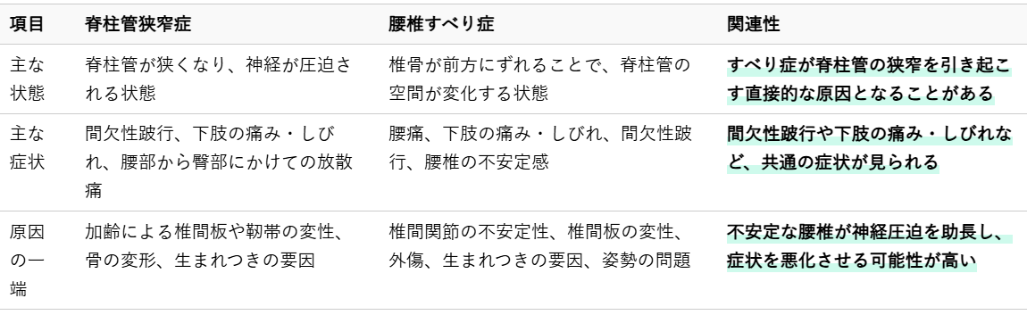 脊柱管狭窄症と腰椎すべり症は、それぞれ異なる状態ですが、密接に関連し合い、併発することも少なくありません。特に、腰椎すべり症が原因で脊柱管狭窄症の症状を引き起こすケースは多く見られます。これらの状態が同時に存在する場合、症状はより複雑になり、日常生活に大きな影響を与えることがあります。