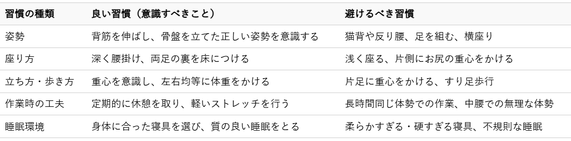 以下に、整体の効果を高め、身体への負担を減らすための生活習慣のポイントをまとめました。