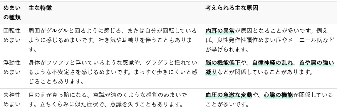 主なめまいの種類とその特徴、考えられる原因をまとめました。
