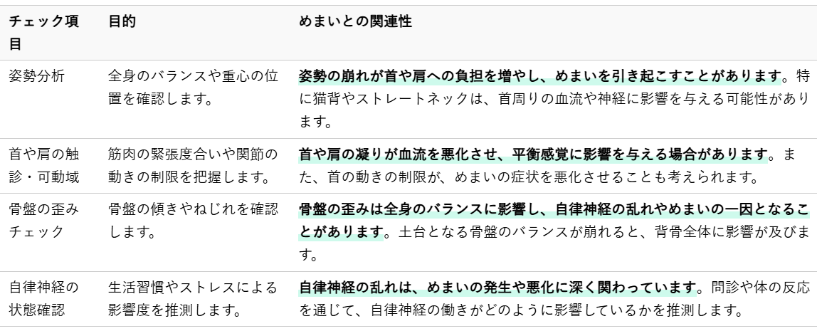 整体院では、めまいの原因を特定するために、まず詳細な体の状態チェックを行います。これは、お客様一人ひとりの体の癖や歪みを把握し、めまいの根本原因に合わせたオーダーメイドの施術計画を立てるために不可欠です。
