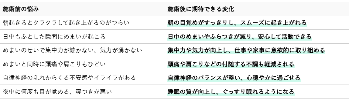 神経機能の改善は、体が本来持っている自然な回復力を高め、めまいの症状だけでなく、全身の不調の改善にもつながることが期待できます。